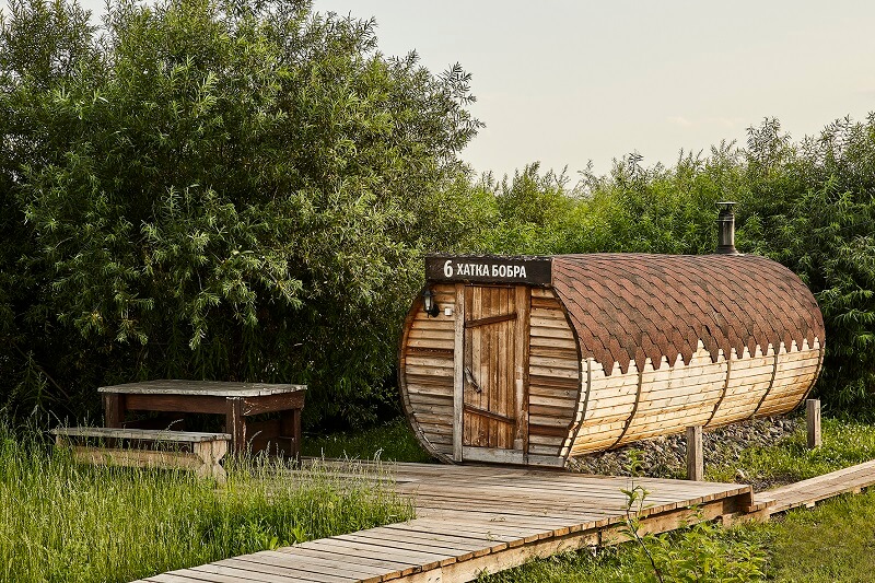 Бочка — это идеальная геометрическая форма для пара. Отличный вариант от души попарится. Здесь вы сможете очень легко регулировать температуру. Есть место для переодевания, комната с лавками и угловыми мини-столиками для каждого. Основной свет – мерцание огня на стенах.